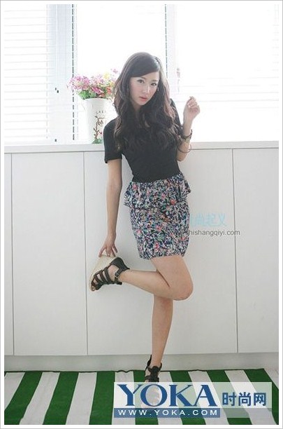 點評:拼接感碎花連衣裙,很別致的拼接設計,配合細膩的碎花的圖案,和黑色TEE搭配,使整件衣服充滿生氣,荷葉邊的點綴讓它層次更豐富。