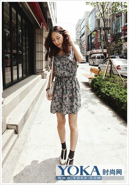 點評:持續(xù)升溫的大花朵圖案也是不可忽視的,背心款修身短裙,安靜典雅,內(nèi)搭藍色TEE和棒球帽的搭配很是怪異可愛!