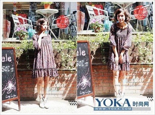 點評:其實從宮廷式的公主袖口便可嗅到一絲復古的氣息,紫紅色系的碎花連衣裙,長度正好露出小臂,避免掉沉悶的版型,更多了輕盈的感覺。A字身形對女生的身材基本沒有限制,我們不必再因為胸圍太窄穿不進去而與那些美好的連衣裙錯過了。