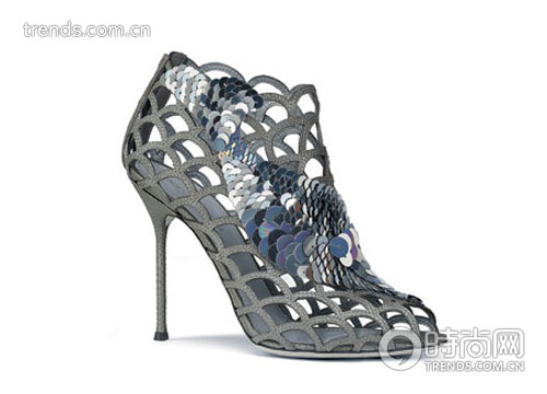3鑲嵌魚鱗狀亮片的高跟鞋能讓派對中的你更閃亮。