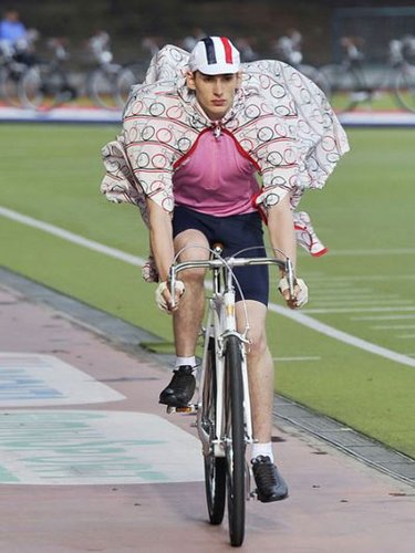 Thom Browne為Moncler Gamme Bleu所做的紅藍色自行車印花