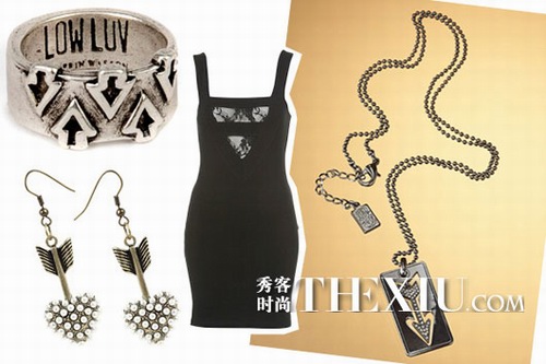 上圖從左:LowLuv x Erin Wasson銀色雙箭戒指,$55;Motel Cutout 系帶裙子,$70;Rachel Roy Arrow 箭形水晶項鏈,$18.99;ASOS 珍珠鑲嵌箭形吊墜耳環(huán)。
