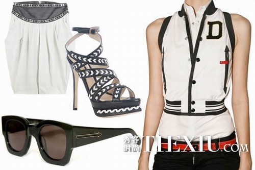 上圖從左:Thurley Arrow Trim TulipsT恤,$127;Clements Ribeiro 箭形花紋高跟鞋,$709.56;Dsquared Maj V領(lǐng)T恤,$710;Karen Walker二號太陽鏡,$170。