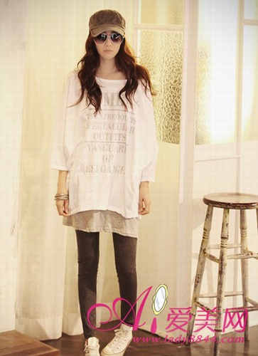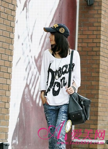 時(shí)尚點(diǎn)評(píng):蝙蝠袖的寬松和飄逸,讓T恤衫顯得更有女人味。個(gè)性化的英文印花更具時(shí)尚魅