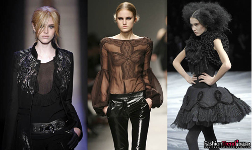 黑色依然是09秋冬的絕對主角,一個革新的趨勢是采用微妙差別的黑與黑的組合。也就是說,如烏鴉一般的一身黑漆漆沒錯,但需要有一些肌理與光澤的變化,比如絲與閃光的亮片,法蘭絨和色丁,天鵝絨與閃光提花的對比效果。但無論怎樣,黑色還是黑色。潮流的推薦是:運用高而窄的造型,黑與黑的多層疊置;比如學(xué)一下Givenchy,以輕量的紗或蕾絲創(chuàng)造表面的差異化對比,再配上wet look濕漉漉的黑色緊身褲,兼具本季最in的黑色歌特浪漫風(fēng)格和搖滾精神。