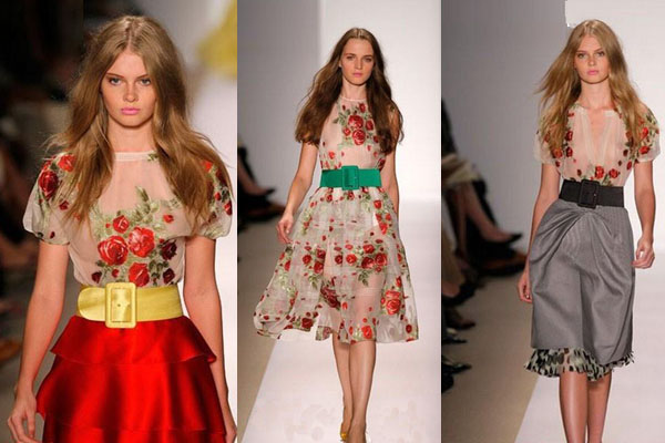 T臺上:碎花雪紡的搭配,以清新為主,與漆皮腰帶的搭配,OL風(fēng)格的春裝,展現(xiàn)的是飄逸的美感。