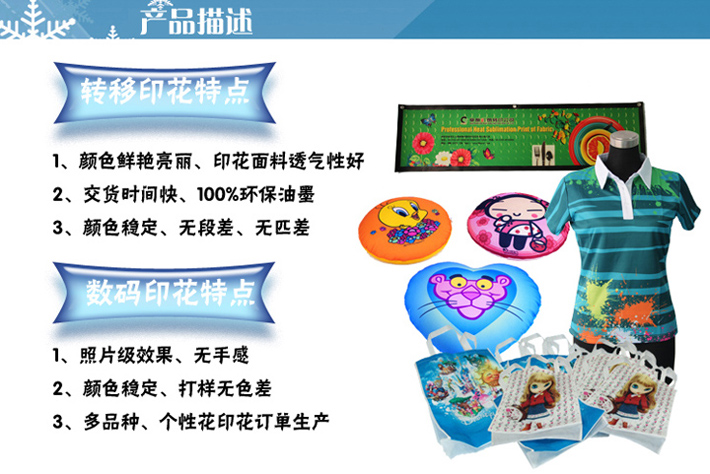 10年來,公司一直熱衷于熱轉(zhuǎn)印熱升華產(chǎn)品技術(shù)的進一步研究與開發(fā),并擁有先進的成套設(shè)備和領(lǐng)先于國內(nèi)同行的升華轉(zhuǎn)印技術(shù)。我公司以制品圖像逼真、色彩亮麗、手感柔軟、交貨快捷等優(yōu)勢成為國內(nèi)外大批集團企業(yè)客戶尋找篩選熱轉(zhuǎn)印產(chǎn)品制造商的最后鎖定廠家。