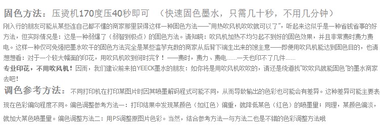 (省墨帶來的好處:YEECK紡織墨水色彩超濃艷,較低噴墨量就能出好色彩,加上真正好質(zhì)量帶來的少浪費(fèi)墨,讓同樣100ml YEECK 墨水,實(shí)際印花數(shù)量可能多出1倍或以上),這樣是不是就可以有:品質(zhì)印花,單件印花成本卻更低 (與用低廉的墨水相比)。