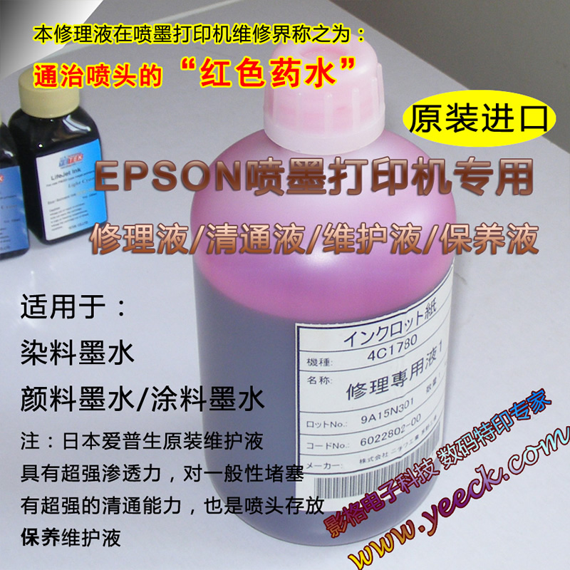 注:日本EPSON原裝維護(hù)液巨頭超強(qiáng)的滲透力,對(duì)一般性堵塞(非死堵)有超強(qiáng)的清通功能,也是噴頭長久存放的保養(yǎng)維護(hù)液。