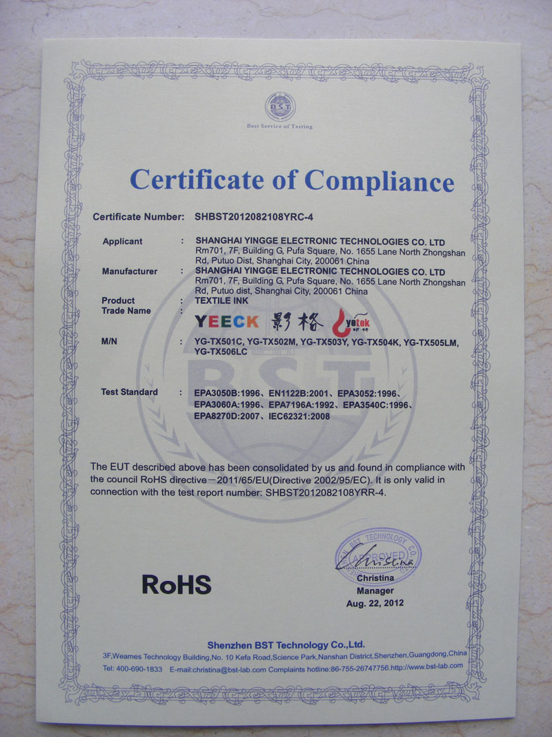 YEECK 6色紡織墨水ROHS證書(歐盟綠色無毒環(huán)保認(rèn)證)