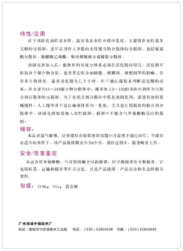 廣州増城中順助劑廠,專(zhuān)業(yè)生產(chǎn):水性異氰酸酯固化劑(交聯(lián)劑)主要用于:印花漿,水漿,植絨漿,植毛漿,牛仔漿,厚板漿固化交聯(lián)作用,等用途。作為印花膠料的內(nèi)交聯(lián)劑,提高附著力,牢度好,拉伸不爆裂,手感柔軟,耐水洗耐磨等性能。