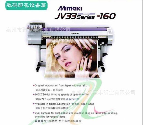 高品質(zhì)、高速度、低價格的JV33系列 MIMAKI JV33的推出,對于噴繪業(yè)者來講,無疑于“忽如一夜春風(fēng)來”。可變墨滴技術(shù)加上最高1440DPI的精度,使打印品質(zhì)達到了業(yè)內(nèi)最高境界;在相同的銷售價格下,實際交活的打印速度可達17.5平方/小時,比前代產(chǎn)品提高了30%;一體化的噴頭,不但避免了煩人的“Pass道”問題,而且大大降低了噴頭實際耗費成本,配合經(jīng)濟劃算的“藝美佳”高品質(zhì)系列墨水,使JV33成為MIMAKI產(chǎn)品中使用成本最低的一款!捌焚|(zhì)、速度、成本”是衡量噴繪機性價比的“黃金三角”,JV33達到了這三個方面完美的平衡。 “專業(yè)定位、穩(wěn)定耐用、技術(shù)領(lǐng)先”是日本MIMAKI的一貫傳統(tǒng),JV33無疑也秉承了這一血統(tǒng)。衡量一輛車的好壞,要到二手市場去看她的價值。對噴繪機的評價,也要看她使用三年、五年后的狀況,專業(yè)的噴繪機,即使每年365天,每天24小時運轉(zhuǎn)也能穩(wěn)定運行,“穩(wěn)定耐用”是專業(yè)客戶衷情于MIMAKI的首要因素;從標(biāo)配的收送系統(tǒng)、加熱裝置等這些配置,能夠看出JV33的專業(yè)定位。