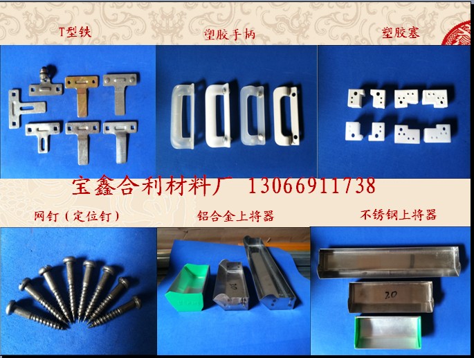 廠家批發(fā)不銹鋼上將器、T型鐵把手、網(wǎng)框膠塞網(wǎng)釘、長圓印花碼仔、網(wǎng)針、