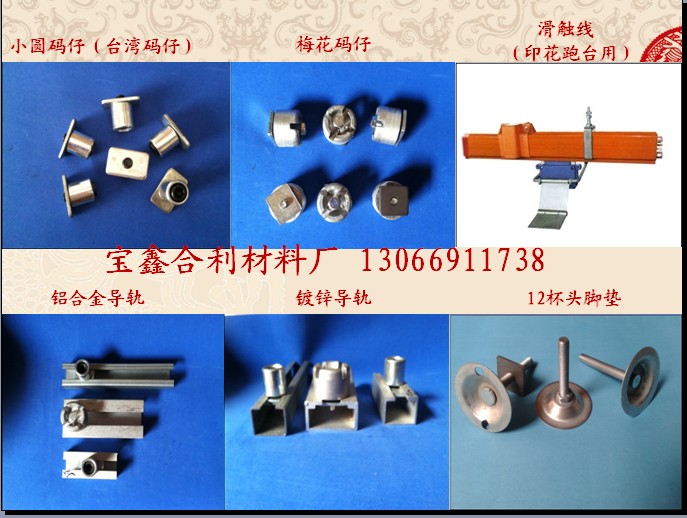 供應(yīng)產(chǎn)品有:小圓碼仔、大小導(dǎo)軌、不銹鋼軌道、滑觸線、跑臺(tái)腳杯、T型鐵、不銹鋼上漿器、方碼仔、長(zhǎng)圓印花碼仔、、鋁梅花碼仔、塑膠把手、塑膠塞、網(wǎng)針、網(wǎng)釘、馬車螺絲、堵塞、靠把、連接板、橢圓形印花機(jī)定位片等材料。