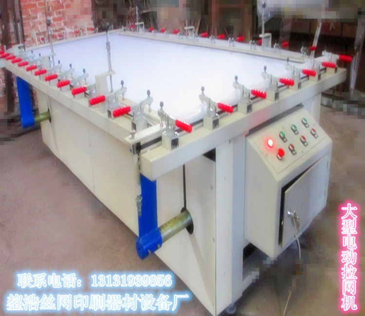 電動繃網(wǎng)機(拉網(wǎng)機) 操作簡單, 設(shè)計合理 ,是制作大型網(wǎng)版的理想器械!此機械采用一體式夾具。一體式夾具拉網(wǎng)機的特性就是拉網(wǎng)緊密不會出現(xiàn)回網(wǎng)布松網(wǎng)布的情況 、具有高張力的特點,而且還能省時省力省人工!