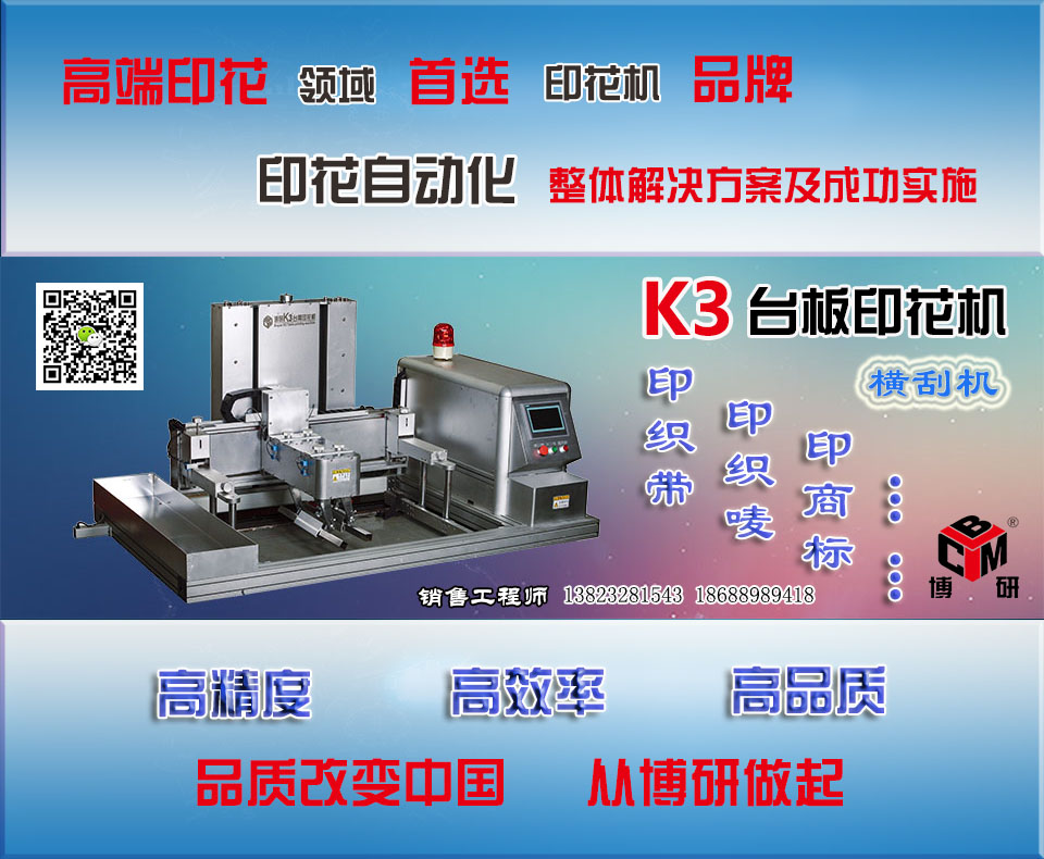 博研公司只做自主研發(fā)產(chǎn)品,我們能為企業(yè)提供的不只是產(chǎn)品,我們提供專業(yè)的解決方案,協(xié)助企業(yè)解決生產(chǎn)難題。深圳博研商用機(jī)械有限公司,07開始專注臺板自動印花機(jī)的研發(fā)設(shè)計(jì)與生產(chǎn),09年開始市場銷售。有針對性的技術(shù)研發(fā),完善的功能設(shè)計(jì),精準(zhǔn)件的生產(chǎn)制造,造就了成熟的K3臺板自動印花機(jī)。滿足了高科技底價(jià)位的自動印花機(jī)市場需求。博研公司感謝各新老客戶一路走來的支持與關(guān)愛,我們將兢兢業(yè)業(yè),精亦求精。 憑借其在自動化印花設(shè)備領(lǐng)域多年的積累和雄厚的技術(shù)研發(fā)實(shí)力,以安全性、穩(wěn)定性、前瞻性、適應(yīng)性為原則,逐步形成了為印花行業(yè)中、高端客戶提供產(chǎn)品研發(fā)、生產(chǎn)、銷售和服務(wù)的能力。博研K3系列臺板印花機(jī)適合裁片和匹裝兩大類承印物,對油墨和涂料的適應(yīng)范圍非常廣泛。K3已被成功應(yīng)用于服裝裁片印花、鞋材印花、箱包皮具印花、工藝品平面印花、文具印花、運(yùn)動器材 、織帶印花、薄膜花紙印花、人造絲花印花、雨傘太陽傘印花、廣告?zhèn)阌』ā徂D(zhuǎn)印紙印花、大幅面匹布接板印花等領(lǐng)域,銷往浙江、福建、四川、湖南、廣東等省區(qū)。博研自創(chuàng)立以來就專注于臺板自動印花機(jī)的創(chuàng)新研發(fā),致力于為印花廠商創(chuàng)造極具競爭力的綜合運(yùn)營平臺。公司擁有自主創(chuàng)新研發(fā)、精密制造臺板自動印花機(jī)及核心器件的能力,同時配套印花工藝開發(fā)出適合臺板印花工藝的配套設(shè)施,全方位提升印花廠商的經(jīng)營效益。