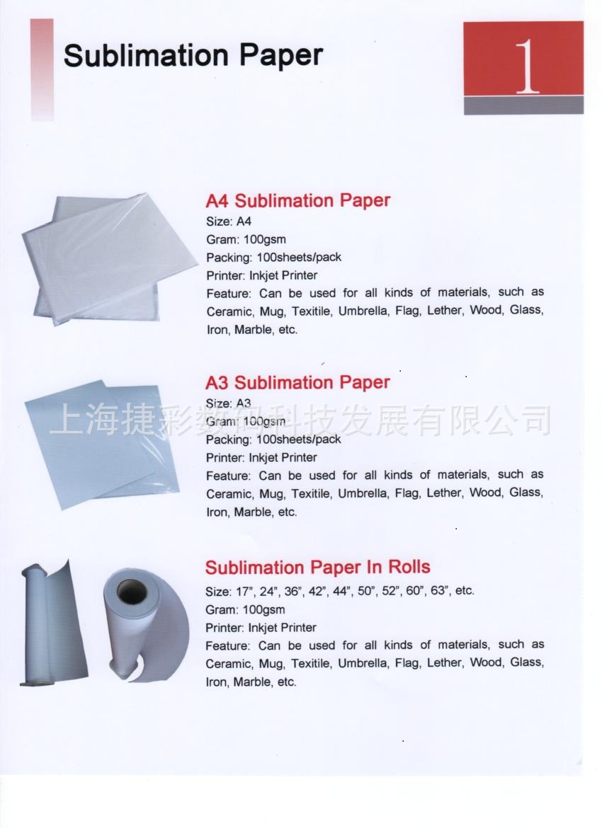 我們所提供的是100g重的熱升華轉(zhuǎn)印紙,白度在82左右,最大寬幅是1860MM, 轉(zhuǎn)印率93%以上,標(biāo)準(zhǔn)長(zhǎng)度是100米,特殊規(guī)格可以訂制,市場(chǎng)常用的規(guī)格是1118, 914,610 這3個(gè)規(guī)格。轉(zhuǎn)印溫度是200-210度,時(shí)間25-60秒,適合壓電式噴墨打印機(jī)。
