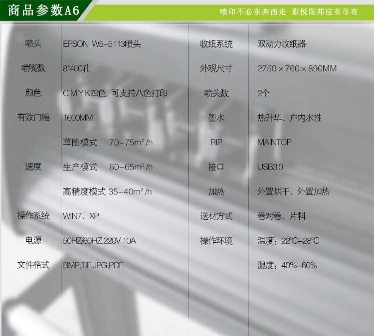 彩悅圖邦A6是一款性價比非常高的熱轉(zhuǎn)印、戶內(nèi)廣告通用的微壓電打印機,實際輸出寬幅1.6米,既可以做熱轉(zhuǎn)印,又可以打市面上常見的戶內(nèi)材料,可謂是一機多用!性價比非常高