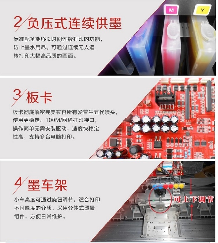 應(yīng)用行業(yè):有戶內(nèi)、外廣告(宣傳頁,電影海報,燈箱海報)、化纖面料轉(zhuǎn)印印花(地毯,地墊,窗簾,雨傘)、皮革數(shù)碼直噴印花(皮鞋,皮包,皮外套)、裝飾品(墻紙,壁紙、無框畫、玻璃移門)、牛津布印花(行李箱,雙肩包,手提包,運動服),真絲(絲巾,旗袍,連衣裙,睡衣等)面料(T恤,家紡,外套,睡衣,家居服等)藝術(shù)品復(fù)制。