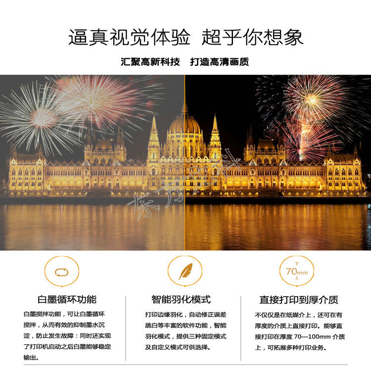 獨特的三層打印功能,能實現(xiàn)彩色+白色+彩色的同時打印,一次成型,特別使用于透明材料的雙面打印應用