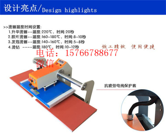 產(chǎn)品適合燙于服裝、手袋、雨傘、鞋、帽、工藝品、廣告用品等。可將發(fā)泡燙畫(huà)、滲透燙畫(huà)、幻彩燙畫(huà)、升華燙畫(huà)、植進(jìn)燙畫(huà)、燙金燙畫(huà)、泳裝燙畫(huà)、電子科技影像燙畫(huà)、燙鉆、燙珠、燙膠等高精度轉(zhuǎn)印到自己所需要燙印的物品上.質(zhì)量保證,售后服務(wù)三包.
