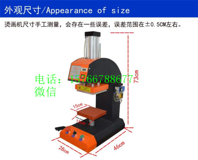 本機(jī)可將各種燙鉆、燙畫(包括打印在熱轉(zhuǎn)印紙上的彩色圖案)經(jīng)熱轉(zhuǎn)印,燙在棉、麻、化纖等織物上,還可進(jìn)行絲網(wǎng)印刷、膠漿、發(fā)泡等工藝熱處理,還可將彩色色標(biāo)、人像照片、風(fēng)景圖案等烤制在瓷板、金屬板上,特別適合制作獎牌、紀(jì)念證牌、墓碑像、文化衫等,經(jīng)濟(jì)又實(shí)用。