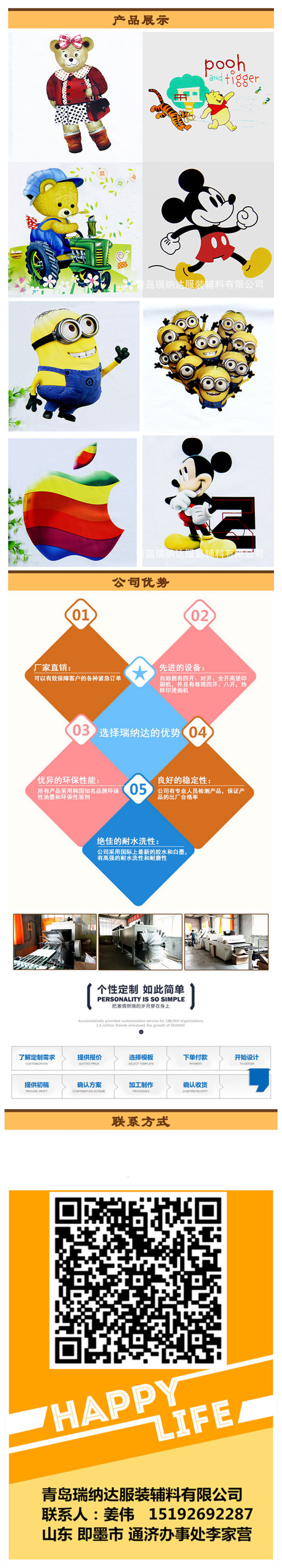 青島瑞納達(dá)服裝輔料有限公司位于美麗的海濱城市青島市即墨李家營(yíng)工業(yè)園內(nèi),本公司是一家對(duì)外承接衣服、布質(zhì)包包、帽子、抱枕、等布料產(chǎn)品上的熱轉(zhuǎn)印燙標(biāo)、燙畫、彩色燙圖商標(biāo)、水洗標(biāo)、吊牌、彩卡等印刷品加工公司,我們以誠(chéng)信作為立業(yè)之本,以求精作為立業(yè)之道,以研發(fā)作為發(fā)展的動(dòng)力源泉,憑借強(qiáng)烈的精品意識(shí)和服務(wù)理念,與多家公司建立了長(zhǎng)期穩(wěn)定的合作關(guān)系,公司自成立以來始終秉承著為客戶做一流的產(chǎn)品為客戶提供一流的服務(wù)。公司擁有一批高素質(zhì)的管理人才及專業(yè)隊(duì)伍,依靠完善的科學(xué)管理、雄厚的技術(shù)力量和先進(jìn)的機(jī)械設(shè)備,為創(chuàng)造出優(yōu)質(zhì)的產(chǎn)品打造了堅(jiān)實(shí)的后盾。本公司重信用、守合同、保證質(zhì)量,贏得了業(yè)內(nèi)外廣大客戶的信任。