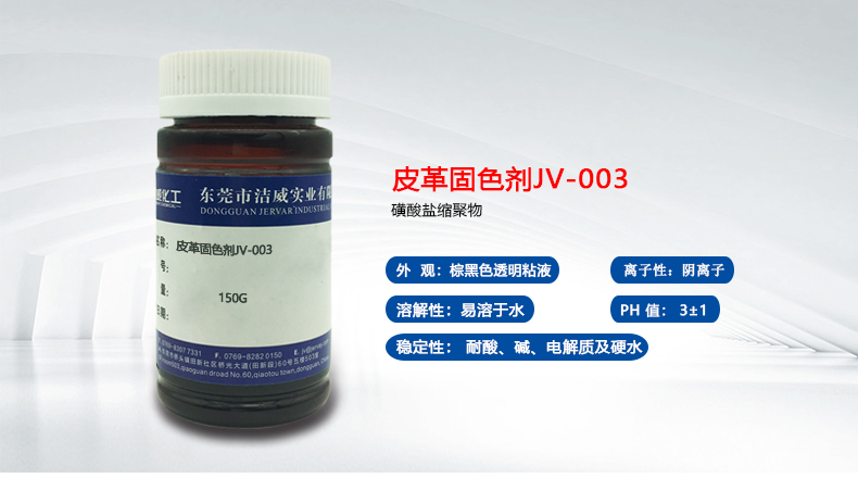 2.固色劑JV-003是羊毛﹑尼龍(錦綸)﹑絲綢﹑皮件等用陰離子染料(酸性染料,金屬絡(luò)合染料)染色之纖維的專用固色劑,經(jīng)處理后的染色物,其水洗堅牢度及汗?jié)n、日曬、耐氯等牢度得到極大提高;