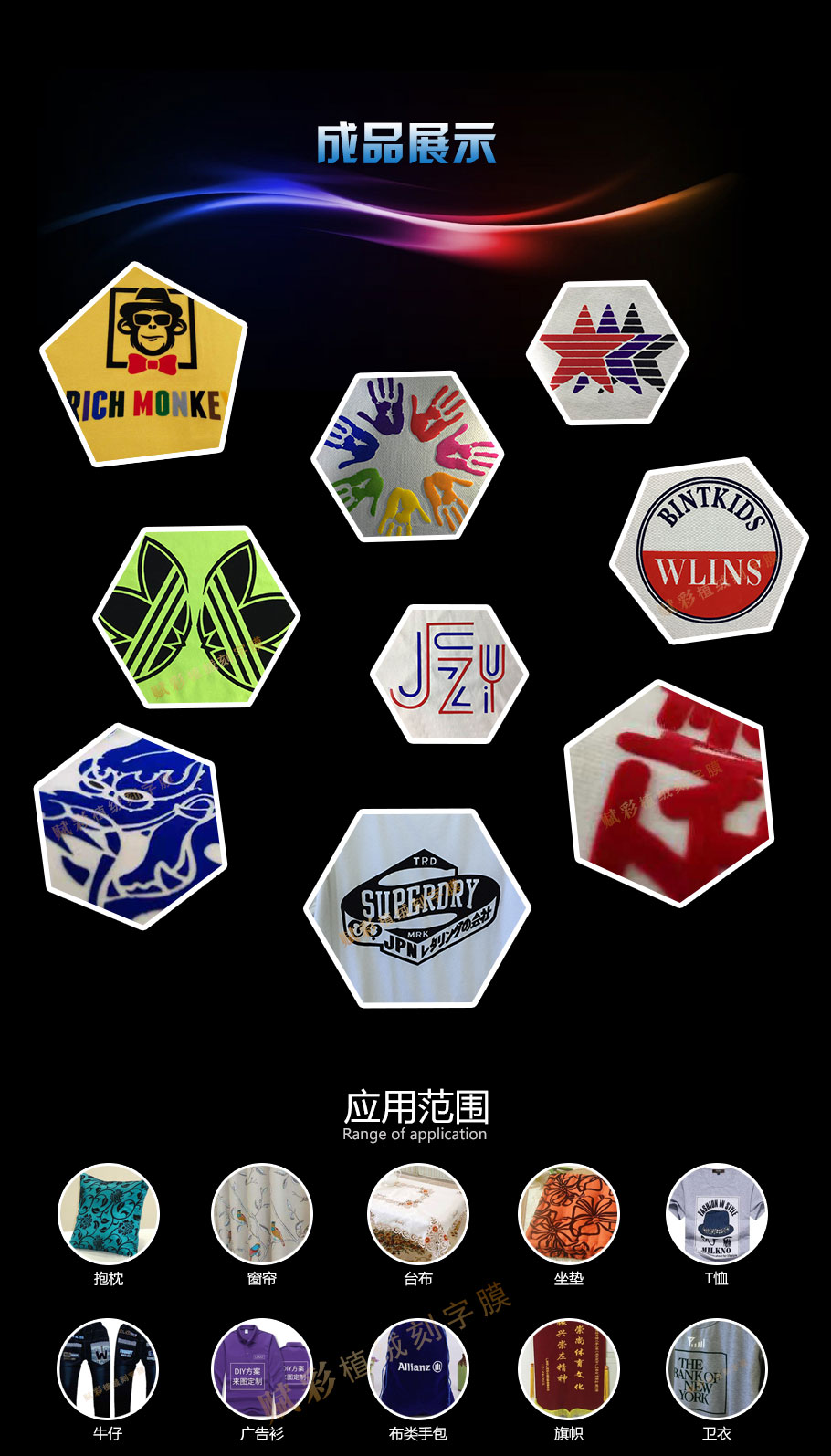 首頁 > 產(chǎn)品供應(yīng) > 印花材料 > 安徽賦彩印花材料有限公司 > 衛(wèi)衣服裝T恤熱轉(zhuǎn)印燙畫貼植絨環(huán)?套帜性圖案定制廠家直銷