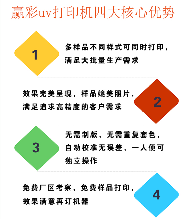 答:UV平板打印機主要核心部件就是噴頭,以圍繞噴頭來選擇機器,目前在國內(nèi)多的噴頭就是愛普生噴頭、精工噴頭、柯尼卡噴頭、理光噴頭這四大類,愛普生噴頭主要是打印針對噴繪寫真的水性墨水(這種平板打印機一般在10萬以內(nèi)),精工噴頭與柯尼卡噴頭主要是針對精度效果要求不高的工業(yè)生產(chǎn)(機格一般是十多萬到二十萬左右),主要打印的是UV墨水;理光噴頭打印UV墨水精度高,效果好,速度快,是用作長時間大批量生產(chǎn)的工業(yè)噴頭(價格十多萬到二十多萬不等)。UV墨水是即打即干,即打即取,可以打印浮雕效果,除了金屬,瓷磚,玻璃需要在產(chǎn)品噴上涂層才能打印,其它的材質(zhì)不需要噴涂層可直接在產(chǎn)品上打印。而水性墨水沒有這種特點,用愛普生噴頭打印水性墨水,在打印任何產(chǎn)品之前都要噴上涂層才能打印。打印后要烘干或自然晾干,而且打印不了浮雕效果。所以工業(yè)級理光噴頭應用更廣泛,工序更簡單。