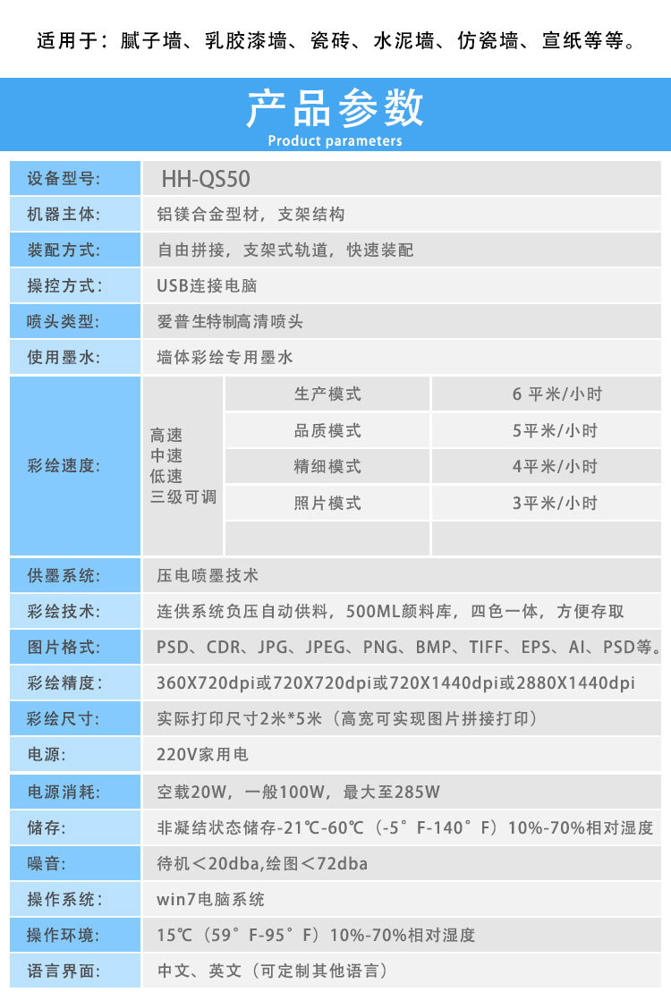②雙噴頭墻體彩繪機(jī):雙噴頭的墻體機(jī)普遍都是使用的愛普生的十代頭,十代頭的售價(jià)一般為1000元到1500元之間(原裝正品)。雙噴頭墻體機(jī)每小時(shí)的普通打印速度為18到24個(gè)平方,高清打印的速度為每小時(shí)12到16個(gè)平方。(英:(2) double head wall painting machine: double head wall machine is generally used epson ten generation head, ten generation head selling price is generally 1000 yuan to 1500 yuan (original quality). The normal printing speed of the double-head waster is 18 to 24 square meters per hour, while the hd printing speed is 12 to 16 square meters per hour.)