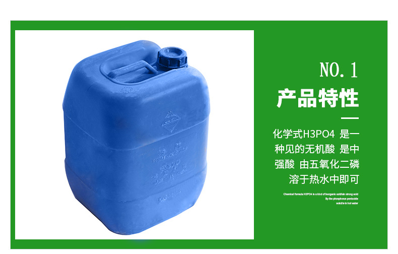 用途:主要用于磷酸鹽工業(yè)、電鍍、拋光工業(yè)、制糖工業(yè)、復(fù)合肥料等。在食品工業(yè)中作為酸味劑、酵母營(yíng)養(yǎng)劑等。名稱:磷酸;CAS號(hào):7664-38-2;分子式:H3PO4;外觀與性狀: 無色透明或略帶淺色稠狀液體,純磷酸為無色結(jié)晶,無臭,具有酸味。磷酸或正磷酸,化學(xué)式H3PO4,分子量為97.994,是一種常見的無機(jī)酸,是中強(qiáng)酸。由五氧化二磷溶于熱水中即可得到。正磷酸工業(yè)上用硫酸處理磷灰石即得。磷酸在空氣中容易潮解。加熱會(huì)失水得到焦磷酸,再進(jìn)一步失水得到偏磷酸。磷酸主要用于制藥、食品、肥料等工業(yè),包括作為防銹劑,食品添加劑,牙科和矯形外科,EDIC腐蝕劑,電解質(zhì),助焊劑,分散劑,工業(yè)腐蝕劑,肥料的原料和組件家居清潔產(chǎn)品。也可用作化學(xué)試劑,磷酸鹽是所有生命形式的營(yíng)養(yǎng)。