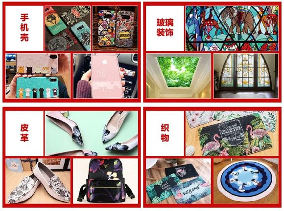 皮革,布料,皮套,手機殼等軟性材料,金屬,亞克力,陶瓷,木板,玻璃,PVC 紙板 塑料等硬性材料