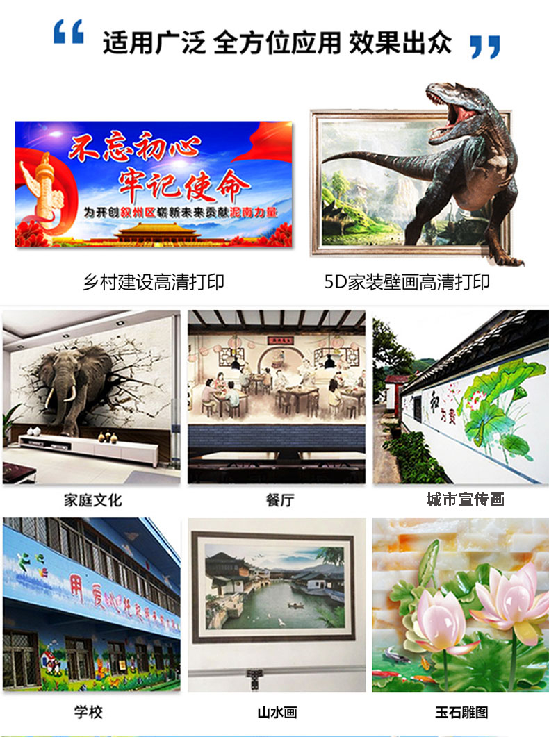 3d墻體彩繪機(jī)目前主要應(yīng)用于:室內(nèi)外墻面彩繪,如政府黨建文化墻,新農(nóng)村文化墻,校園文化墻,室內(nèi)背景墻,壁紙,三聯(lián)畫,宣紙,墻布,餐廳墻面等彩繪行業(yè)。