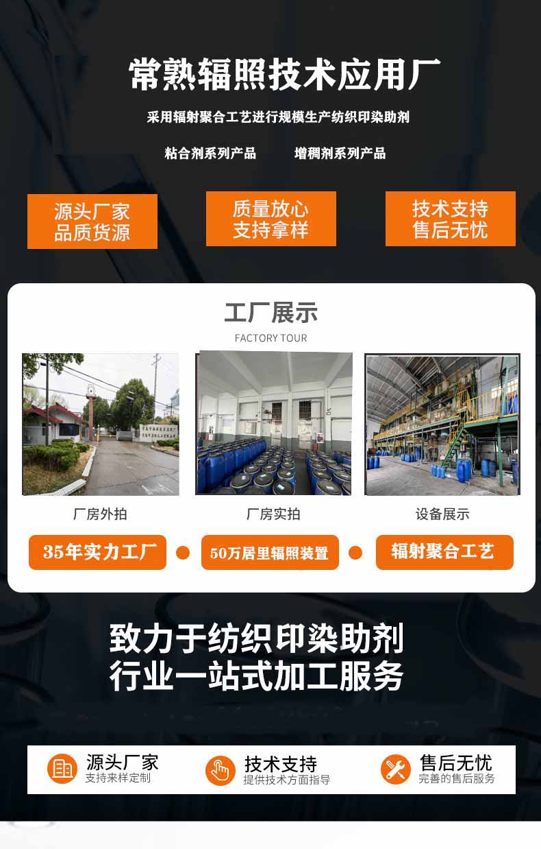 提供紡織染整助劑,紡織印染助劑生產(chǎn)廠生產(chǎn)仿活性粘合劑、高牢度粘合劑、印花粘合劑、粘合劑、拔印粘合劑;分散增稠劑、涂料增稠劑、活性增稠劑、免水洗增稠劑