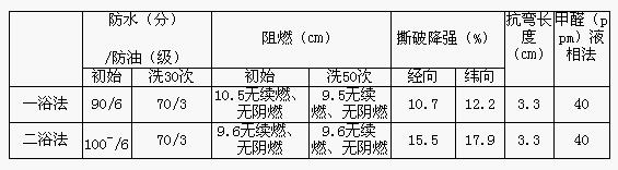 2.3.4.1 三防+阻燃整理,兩浴法比一浴法初始防水和阻燃效果好,二種工藝對防油性無影響;洗后兩種工藝三防和阻燃效果相同;根據(jù)客戶對三防和阻燃的不同要求,可選用不同的生產(chǎn)工藝。