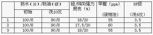 工藝:一浸一軋(帶液70%)→烘干(100℃)→焙烘(150℃×3′)→堿洗→烘干(100℃)→浸軋三防液(帶液70%)→烘干→三防焙烘(150℃×3′)→檢測→洗滌→檢測