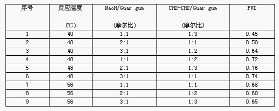 影響Guar gum化學(xué)改性的因素有反應(yīng)介質(zhì),反應(yīng)溫度、反應(yīng)時間、原料配比等等。據(jù)報導(dǎo)[4]植物膠醚化反應(yīng)到達(dá)一定時間后,化學(xué)改性已趨向平衡,變化較小而臨近終點,為此可以把醚化反應(yīng)時間固定,而反應(yīng)介質(zhì)在預(yù)試驗中已確定為乙醇,故這里主要考察反應(yīng)溫度、氫氧化鈉用量,環(huán)氧乙烷同Guar gum中葡萄糖結(jié)構(gòu)單元的摩比,對印染粘性指數(shù)PVI的影響,采用三因素三水平正交試驗Lg(34)