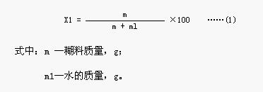 稱取糊料12g,準(zhǔn)確至0.2g,在高速攪拌下,逐漸加入170ml水,使之成為均勻糊狀物。放置24h后用NDJ-1型旋轉(zhuǎn)式粘度計(取4號轉(zhuǎn)子、轉(zhuǎn)速為30r/min,溫度在25℃±1℃)測定糊狀物粘度,用水調(diào)節(jié)直至粘度為l0±0.5pa·s時,記取水的用量。以下式計算含固量(X1):