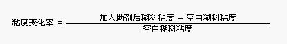 將空白糊及備好的上述糊料在25±1℃條件下,用4號轉(zhuǎn)子30r/min測定其粘度,然后按下式計算對染料及助劑的粘度變化率。