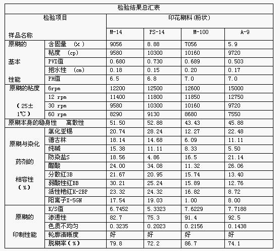 相容性配方:原糊100g,水25g,染料或助劑Xg 。