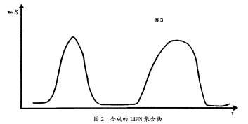 將乳化單體I和乳化單體Ⅱ分別單獨(dú)乳液聚合以及上面實(shí)驗(yàn)合成的粘合劑乳液,分別成膜,三個(gè)膜用熱分析儀示差掃描量熱法(DSC)分別測定其玻璃化轉(zhuǎn)變溫度(Tg)。測定結(jié)果如圖表明,乳化單體l和乳化單體Ⅱ的聚合物都僅有一個(gè)Tg,其Tg轉(zhuǎn)變區(qū)寬度分別為31度和35度,而合成的LIPN則有兩個(gè)Tg,其中低溫的Tg向高溫方向移動(dòng)3度,而高溫的Tg向低溫方向移動(dòng)4度。而且其Tg轉(zhuǎn)變區(qū)間寬度則分別增加為40度和44度。這表明它們之間產(chǎn)生了一定的相容性,在溶解度實(shí)驗(yàn)中我們已經(jīng)知道,它們之間的不相容性,由此我們可以認(rèn)為一定的IPN結(jié)構(gòu)存在著。