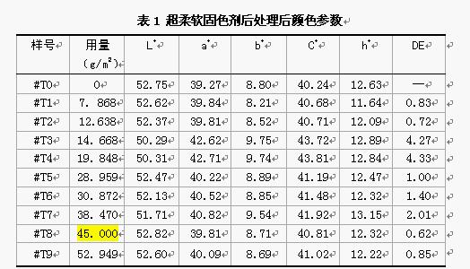 表1顯示,隨著超柔軟固色劑用量的加大,明度L值和彩度C值變化不明顯。b值變化幅度不大,說明隨著使用量的加大,泛黃現(xiàn)象也并不明顯。