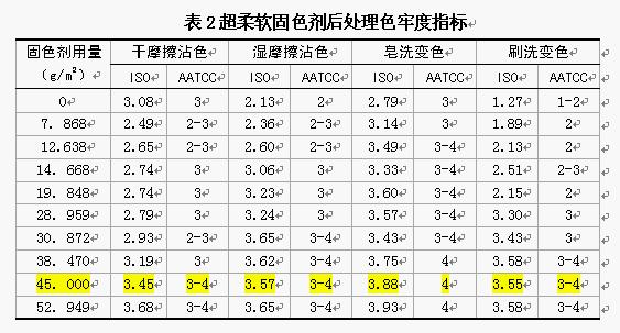 由上表可知:使用超柔軟固色劑后,干摩擦沾色牢度變化比較緩慢,但隨著其用量的增加,干沾色牢度有半級的提高,當(dāng)用量達(dá)到45.00g/m2以上時(shí),可達(dá)到3-4級;而濕摩擦沾色牢度有明顯的上升趨勢,當(dāng)用量達(dá)到30.00g/m2以上時(shí),便可達(dá)到3-4級,大約提高一級以上。皂洗及耐刷洗色牢度提高也非常明顯,分別可達(dá)到4級和3-4級。另外經(jīng)處理后織物仍然非常柔軟,手感損傷很少。