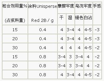 注:PU粘合劑用量、涂料Unisperse Red 2B、邦A(yù)漿、脲素0.6g , 合計20g,焙烘溫度130℃,焙烘2min.