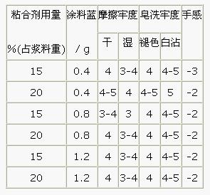 由表3可以看出,各項牢度不算太好,中色的干摩擦牢度較差。在水洗或皂洗時,粘合劑發(fā)生溶脹,粘著力和薄膜的耐磨性降低,印花色牢度變差。
