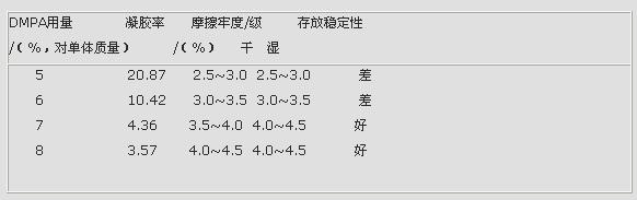表4 二羥甲基丙酸(DMPA)用量為粘合劑性能有影響