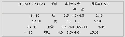 從表5可以看出,M(PU):M(PA)在1:10~2:10時手感最好;隨PU的增加,手感逐漸變硬,,干濕摩擦牢度變好,但凝膠率增加。因此,適宜的比例為1:10。