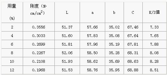 在相同條件下,采用有機(jī)硅含量為12%的粘合劑與SUPERPRINT 101分別進(jìn)行印花,然后測試印花織物的性能。從表中數(shù)據(jù)可看出,Superbinder粘合劑的剛度、L和C值、K/S值均小于SUPERPRINT 101,說明所合成的粘合劑手感較好,顏色鮮艷度和顏色深度略差,干濕摩擦牢度與后者相同。