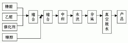 本實(shí)驗(yàn)采用乙醛在適當(dāng)?shù)拇呋瘎┫驴膳c糠醛反應(yīng),確定了如下合成工藝: